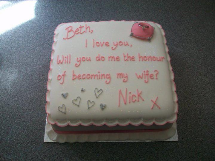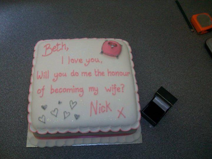 Beth walked past the shop’s window stopping to admire the cakes as normal, only this time she found a special message addressed to her with a beautiful ring placed on an icing pillow and her boyfriend down on one knee asking her to marry him.