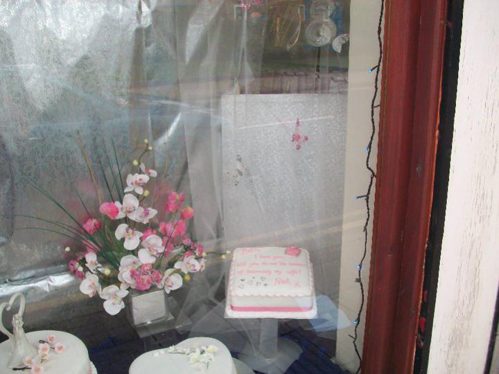 Nick and Beth often walked past our shop in Coalville and admired the different cakes in our window display, so Nick thought it only was only fitting to give Beth her own cake within that very window.