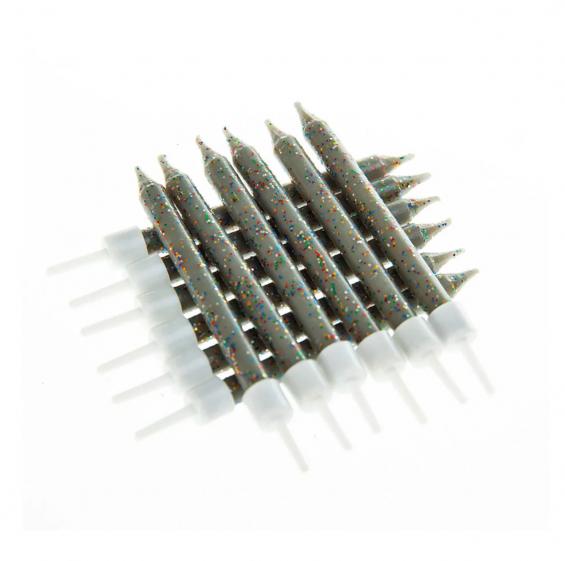 ... Find out moreDon't forget those all important candles on top of the birthday cake with these grey glitter candles with holders. Pack of 12. Each candle is approx. 7.5cm (3")