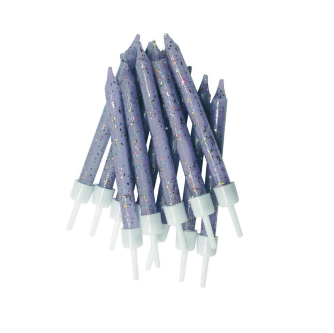 ... Find out moreDon't forget those all important candles on top of the birthday cake with these lilac glitter candles with holders. Pack of 12. Each candle is approx. 7.5cm (3")