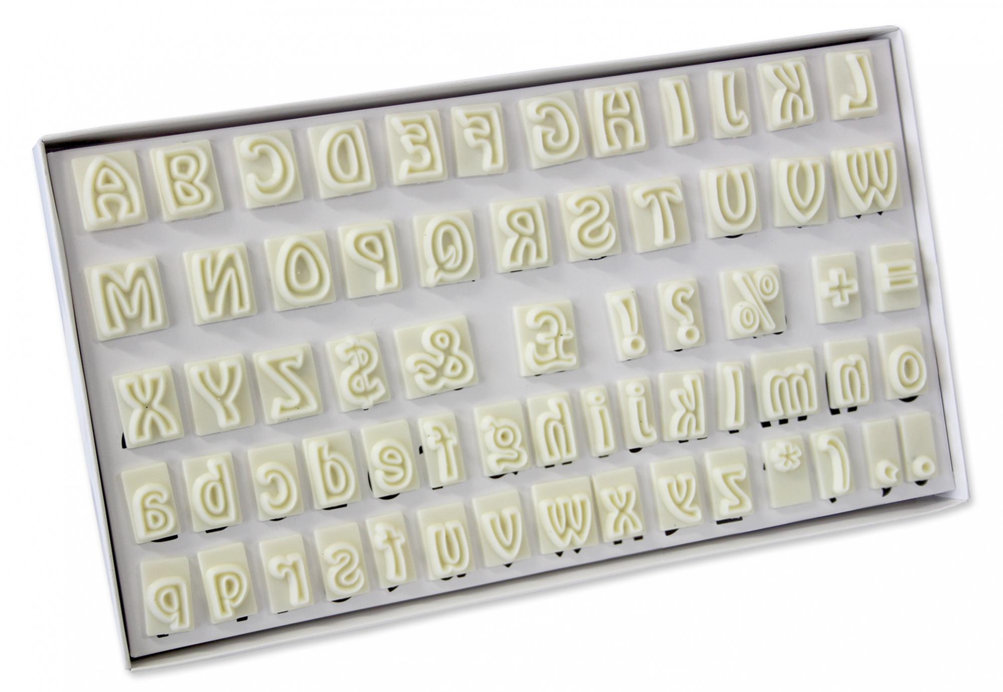 Complete set of 64 alphabet characters. Includes uppercase and lowercase letters that are great for spelling out messages on your celebration cakes. The JEM Alphabet Cutters Set contains 64 individual letters of the alphabet in both upper and lower case plus the characters � $ & ! ? % + = * ( . , Dimensions: 16 mm (_") uppercase height, 12 mm (_") lowercase height. For best results use with the JEM Foam Pad. Ideal for celebration cakes and crafts. Made from high quality ABS Thermoplastic. Dimensions: 16 mm (_") uppercase height, 12 mm (_") lowercase height. Handwashing recommended - 106M001