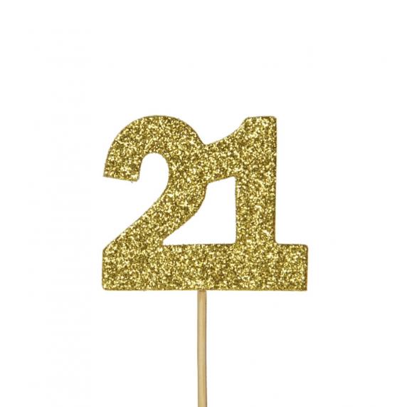 Gold glitter number twenty one - numeral 21, cupcake toppers, each numeral measures 3.8 x 4.5cm (1.5 x 1.8") and the Pick measures 6.5cm (2.6").