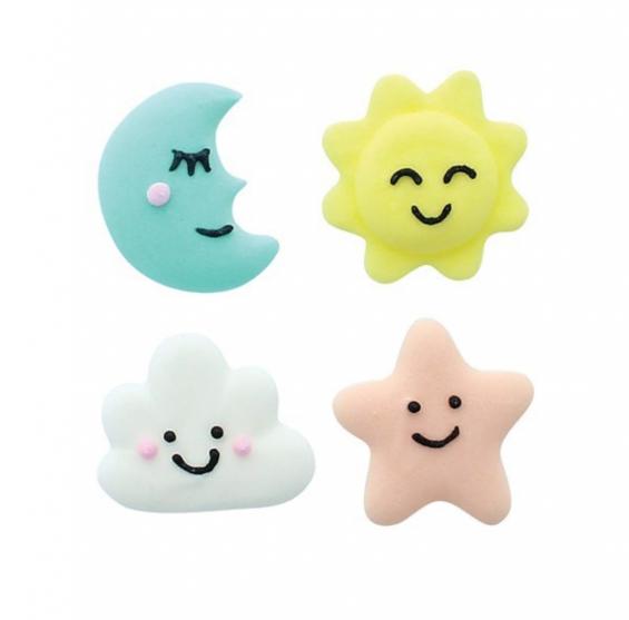 The pretty pastel coloured decorations include a sun, star, moon and cloud. Ideal for cupcakes, cakes and cookies, these sugar decorations are completely edible and easy to use.