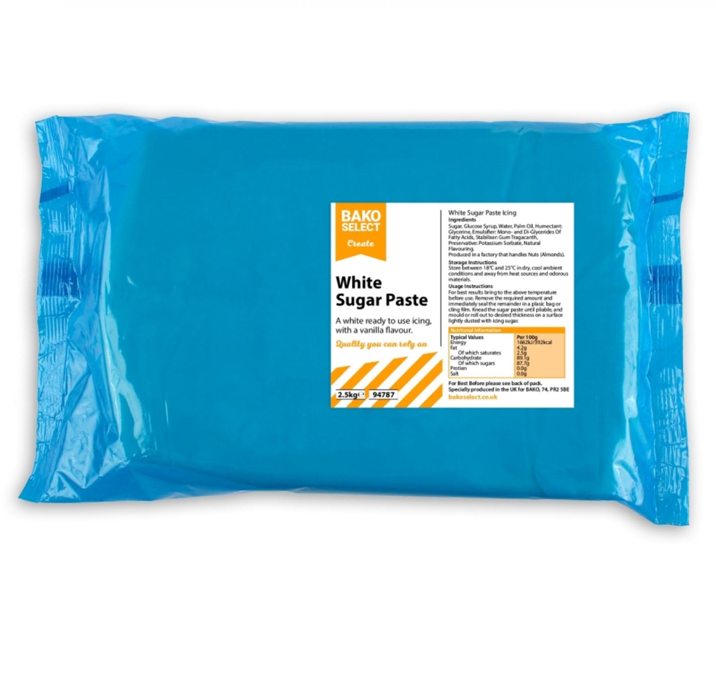 Bako's sugar paste can be rolled out, modelled & used with cutters or moulds. Perfect for icing cakes, cupcakes & cookies. This white sugar paste is perfect for adding food colourings to simply by needing in using your hands. This pack contains 1 x 2.5kg white sugar paste.