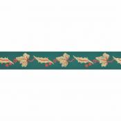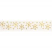 This Pale Blue ribbon is made from a cut edge, woven acetate fabric. The snowflake motifs are made from a silver coloured foil printed on the front face of the ribbon. It is 36mm wide and comes on a 25m roll.