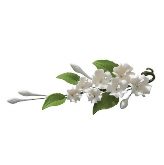 A delicate white floral spray with leaves, perfect as a wedding cake topper.