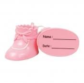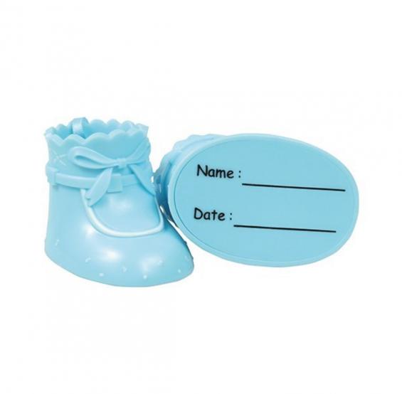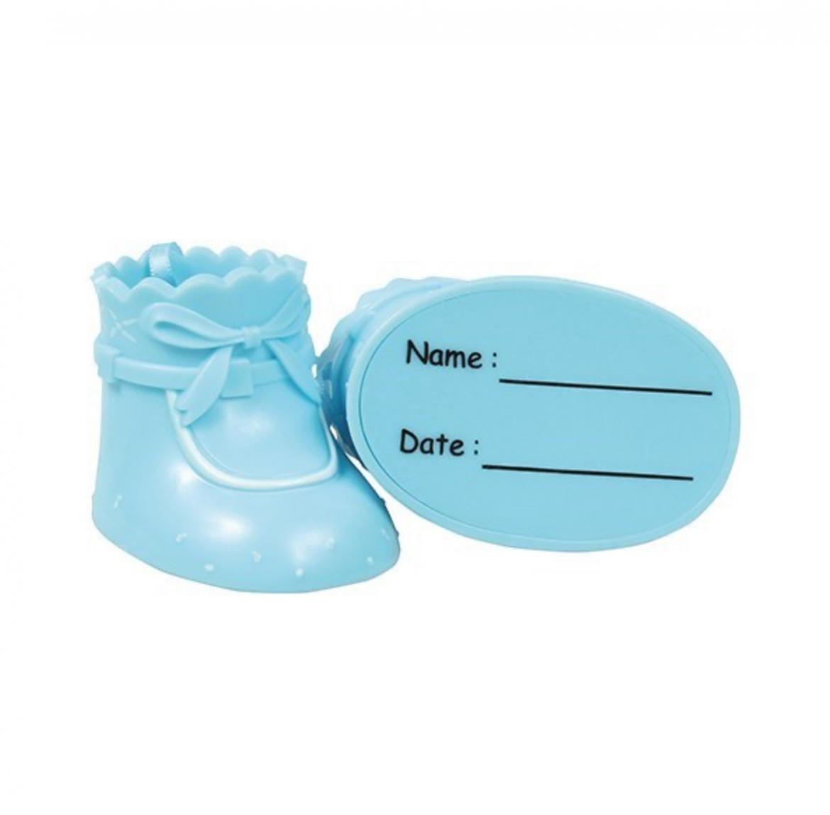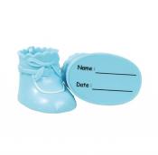 The decoration features a lovely pair of light blue booties with labels on the underside to record the baby's date of birth and other memorable details.