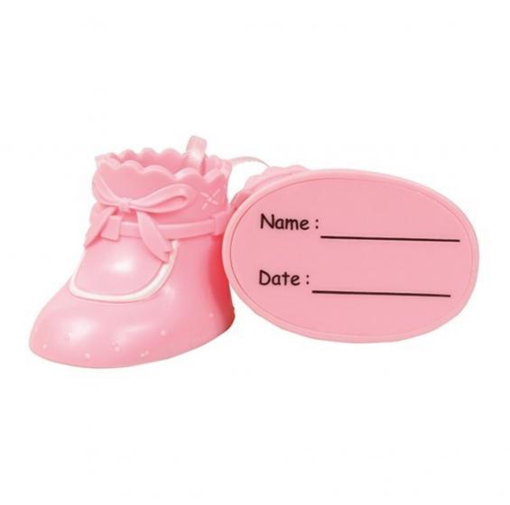 The decoration features a lovely pair of light pink booties with labels on the underside to record the baby's date of birth and other memorable details. Perfect for newborn and Christening cakes and a lovely keepsake.