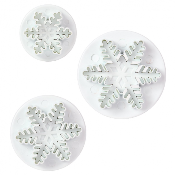 This set of three plastic Culpitt plunger cutters are very simple to use, simply press firmly in to your sugar paste and release to create a frosty snowflake in 3 sizes. 25mm, 40mm & 55mm