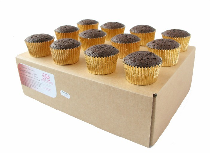 24 'ready to decorate' chocolate cupcakes in gold cases. Perfect for creating cupcake towers for weddings and other celebrations. The cupcake cases have a 50mm base diameter by 38mm high and have a great shelf life (approximately 4 weeks from baking) but as they are so small will dry out quickly once left in the open air. For best results, keep well wrapped in the original packaging.