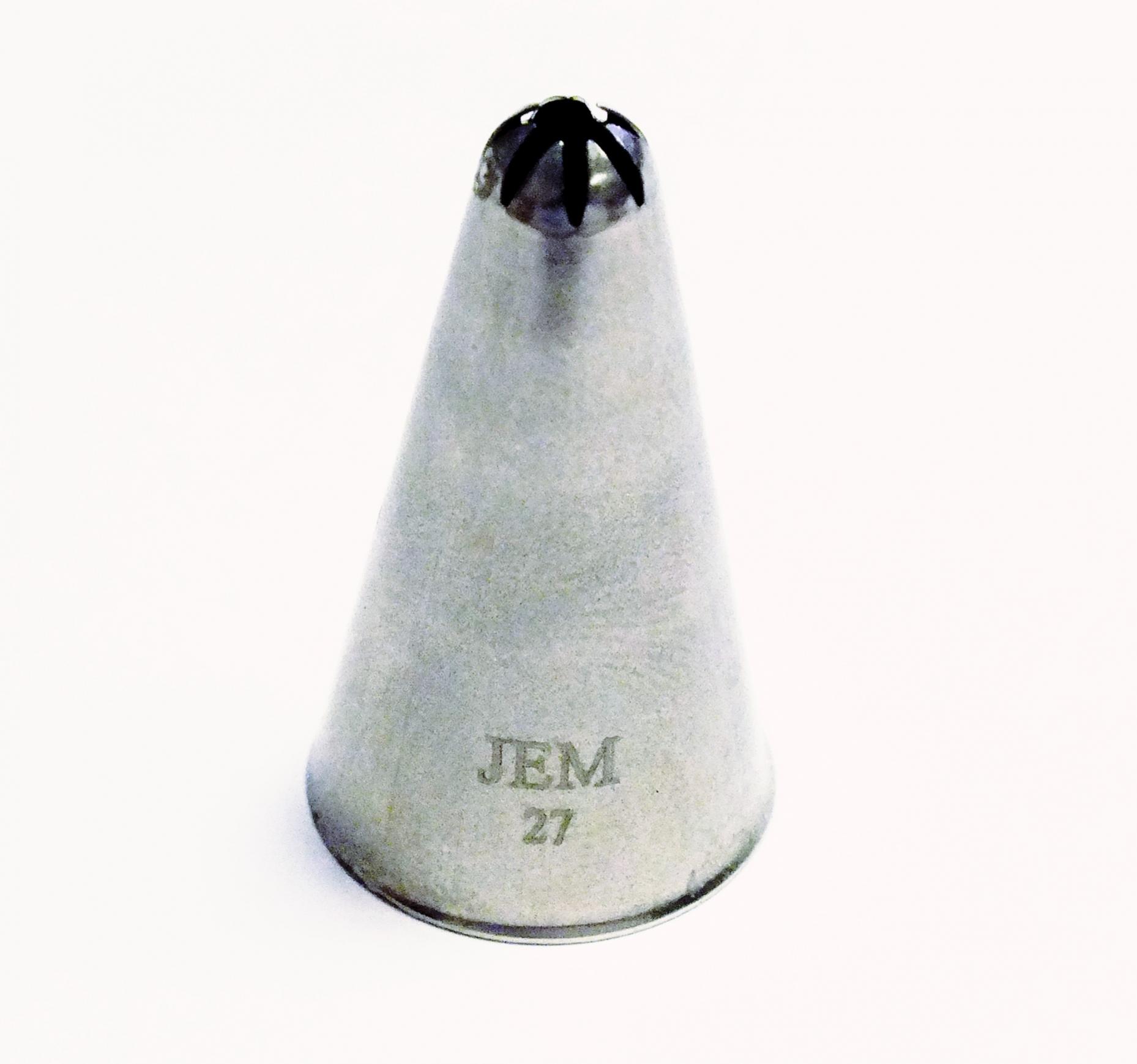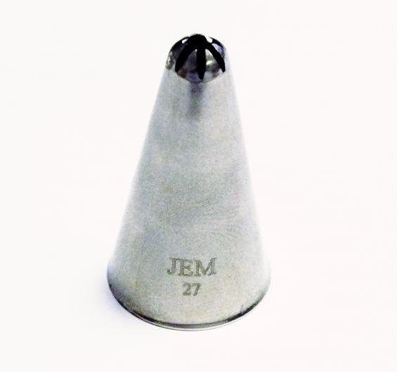 JEM Closed Star Piping Nozzle no. 27 Ideal for drop flowers, shells, rosettes and grooved stars Dimensions : Tip diameter 6.5 mm Base diameter 18 mm Height 30.5 mm No. of points: 7 All nozzles work with ... Find out more