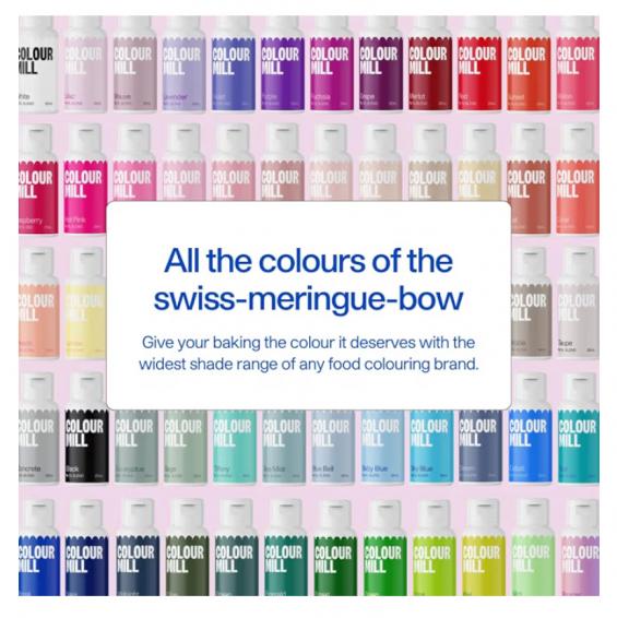 Unlike your average gel colours, Colour Mill loves the fats and oils found in your baking, and uses it to disperse the special formula colouring. This results in stunningly vibrant, consistent shades that will not fade. It works especially great in buttercream, Swiss meringue, chocolate, cake batter, ganache and sugar pastes. It also works in flower pastes, gum pastes, modelling pastes, royal icing, marzipan, cake mixes, pastry, frostings, isomalt, piping gel, cake lace mixes and more.