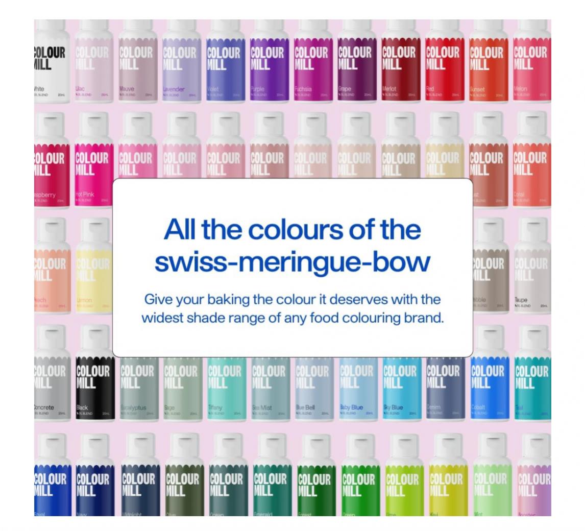 Unlike your average gel colours, Colour Mill loves the fats and oils found in your baking, and uses it to disperse the special formula colouring. This results in stunningly vibrant, consistent shades that will not fade. It works especially great in buttercream, Swiss meringue, chocolate, cake batter, ganache and sugar pastes. It also works in flower pastes, gum pastes, modelling pastes, royal icing, marzipan, cake mixes, pastry, frostings, isomalt, piping gel, cake lace mixes and more.