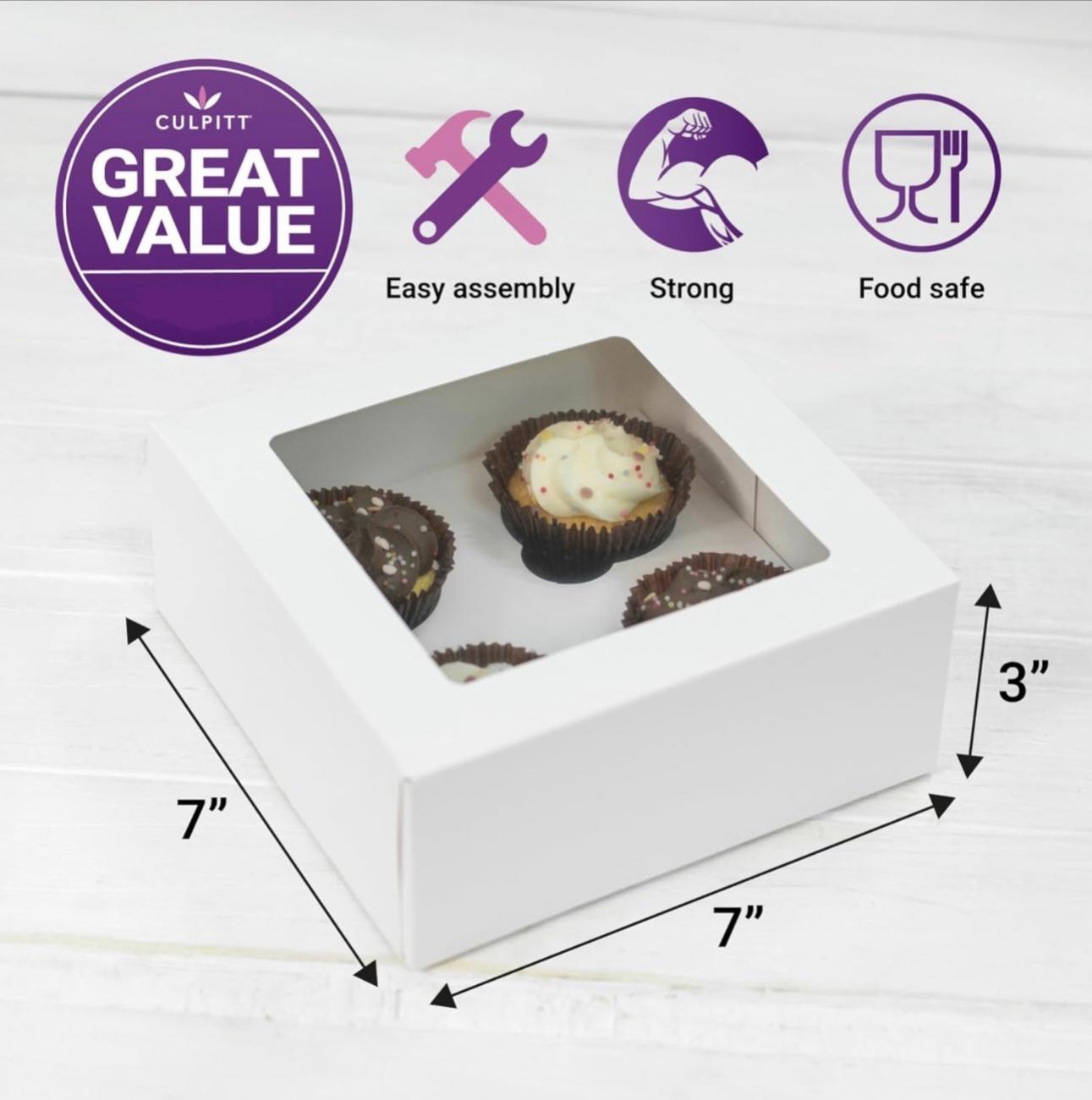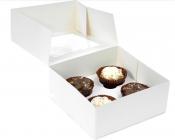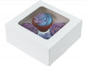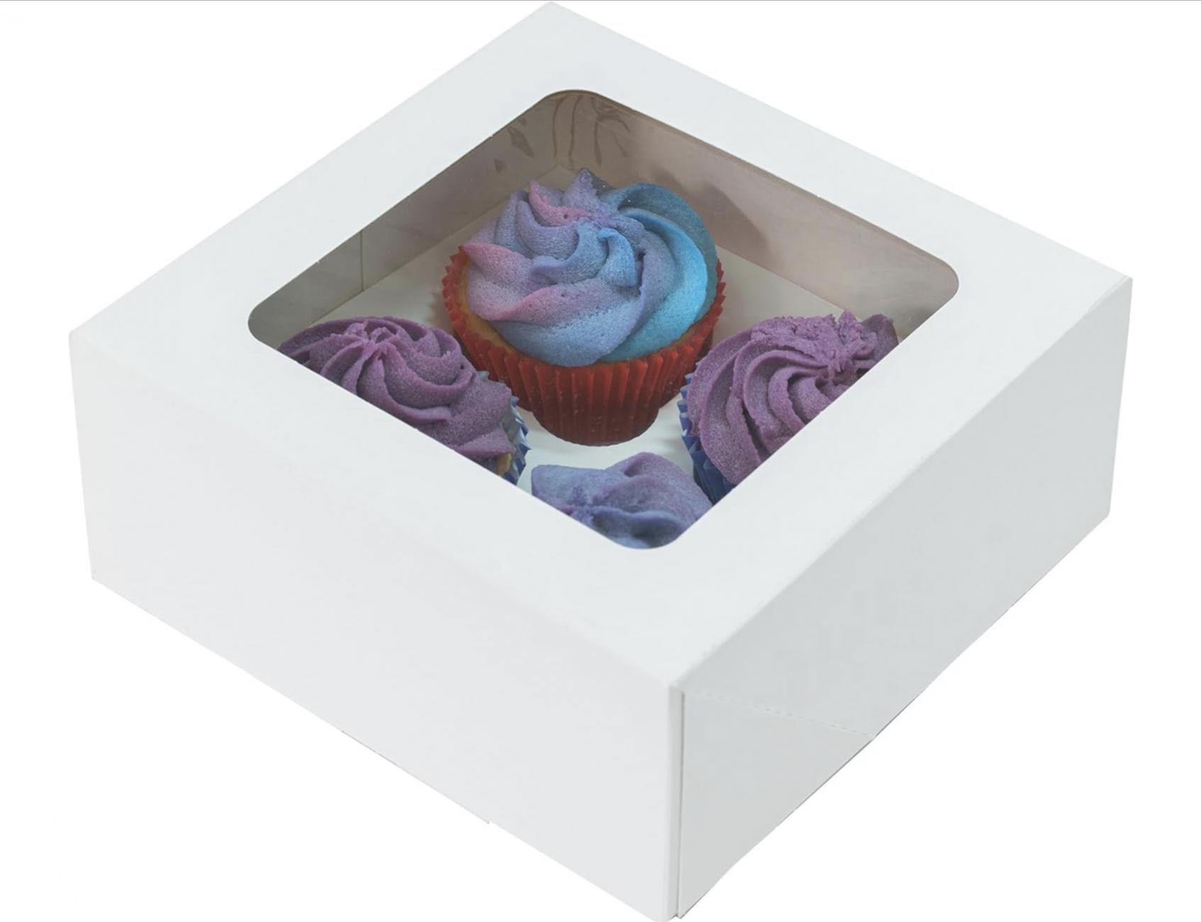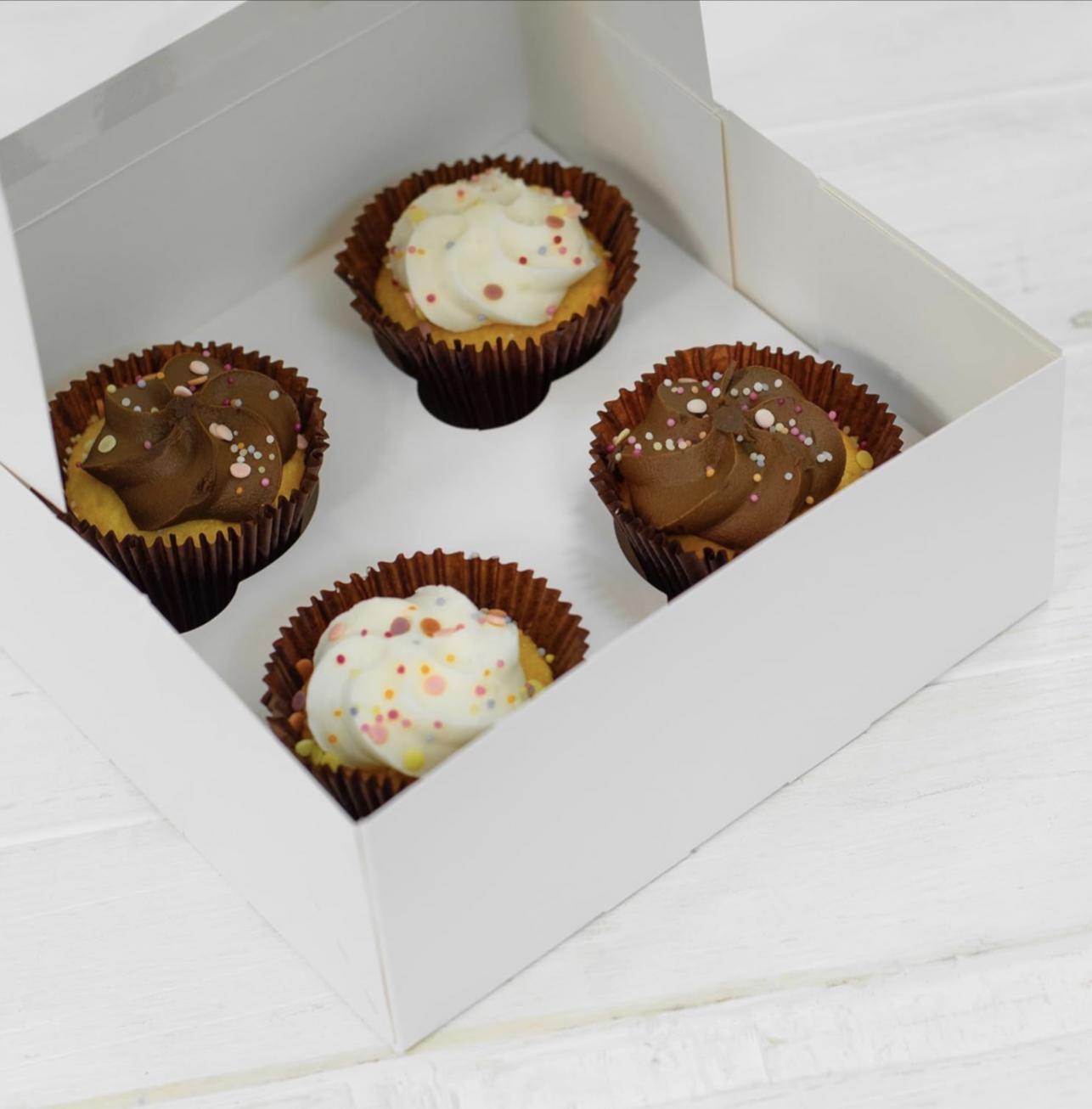 Flat packed white cupcake box, perfect for four cupcakes, box also contains 1x insert to keep your cupcakes in place.