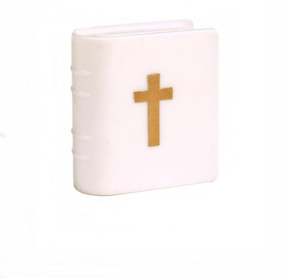 This white plastic bible featuring a gold cross is suitable for contact with sugar.