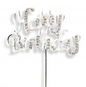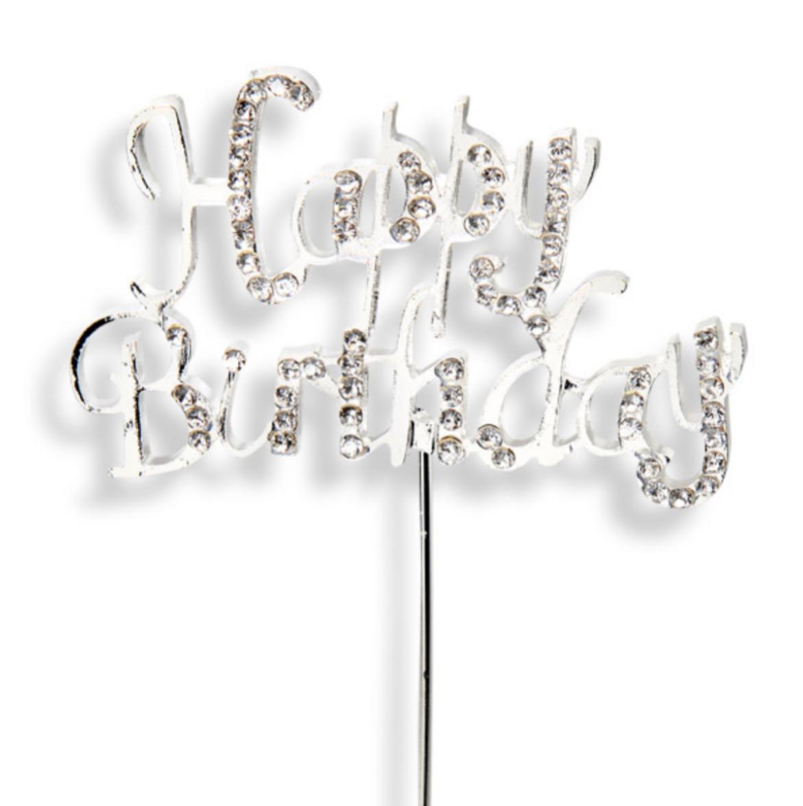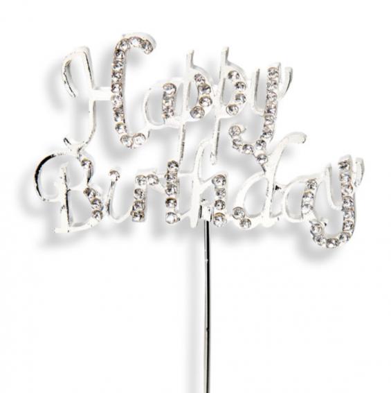 A great addition to a birthday cake this diamante Happy Birthday on a silver stem is 6.5 x 3.5cm.
