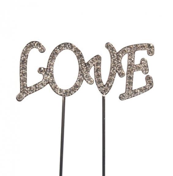 Give wedding cakes a sparkling touch with this pretty diamante 'Love' on a silver wire. This decoration is great for celebrating weddings, engagements and anniversaries. Please note this product should not be inserted directly into cakes. We advise you place the wire a suitably sized posy pick before use. Dimensions: 38mm x 77mm