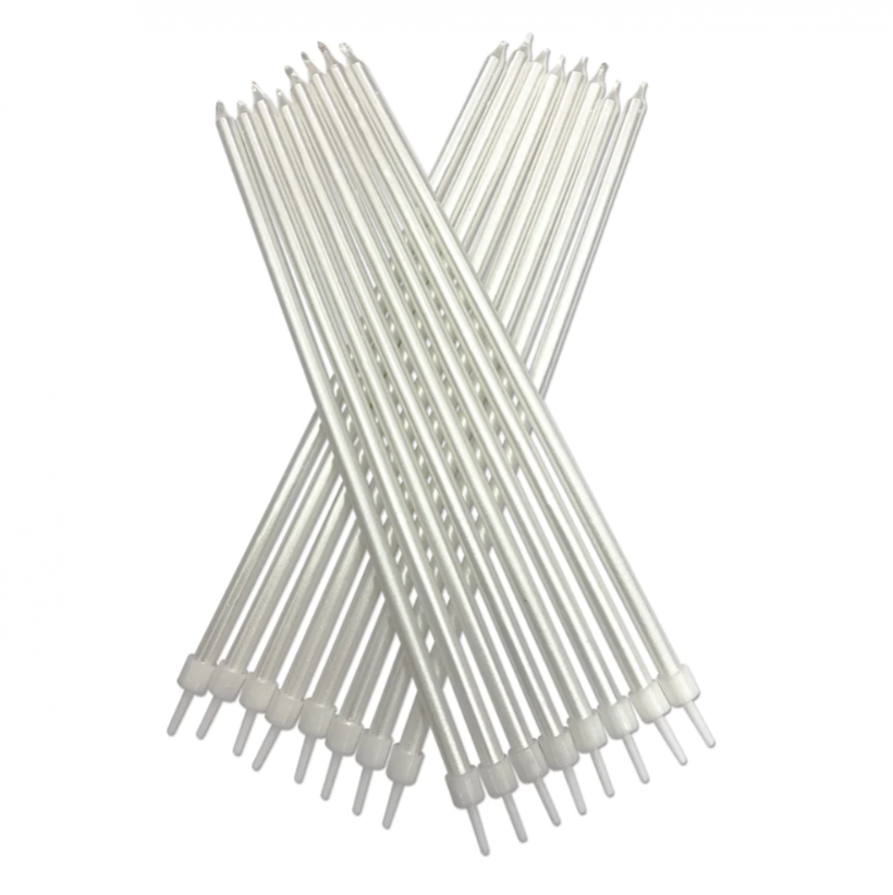 A great way to add more sparkle to the top of your birthday cake creations with these extra tall Pearlescent white candles. 18cm.