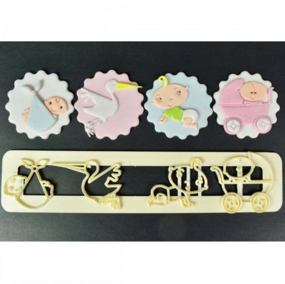 The cutter features 4 newborn baby designs including a baby in a pram, a crawling baby, a stork and a baby in a blanket.