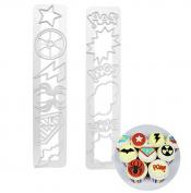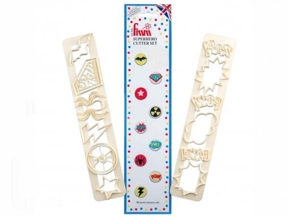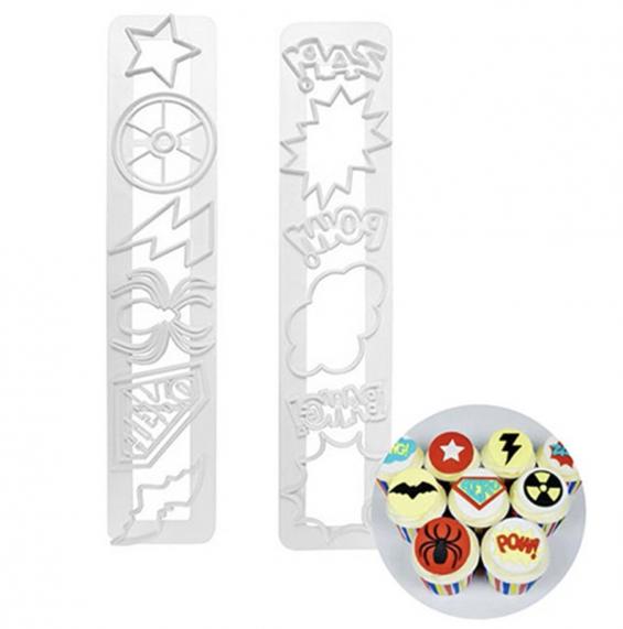 This cutter set makes it quick and easy to create superhero designs. The two strip set features icons such as a lightening bolt, hero badge, spider and wording like Bang! and Pow!