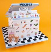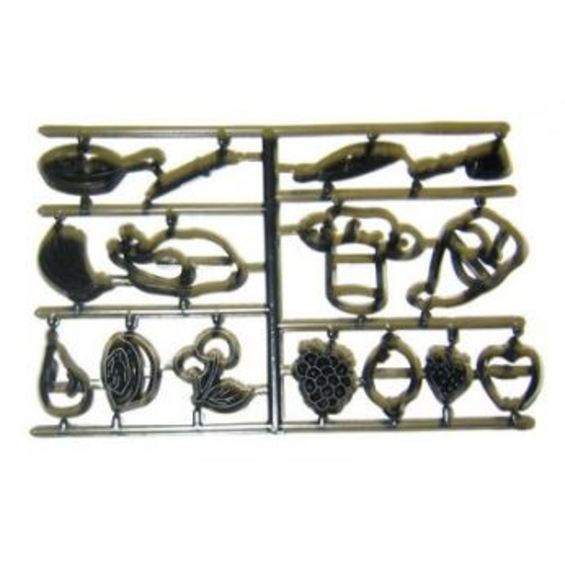 A Fruit and Utensils cutter from Patchwork Cutters. This set includes a knife and chefs hat, fruit, fish, a chicken and lamb joint.Ideal for a celebration cake for a chef. Sizes: between 15mm and 45mm.