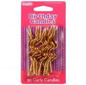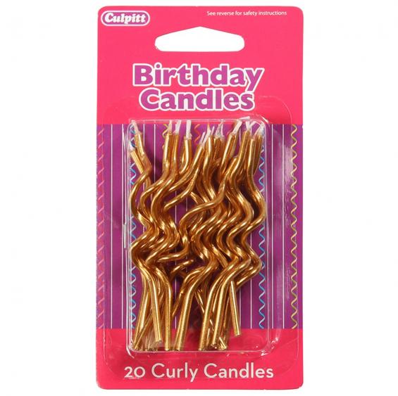 Funky gold curly candles with no holders, these look fantastic on a wide range of cakes, particularly on stacked cakes. 20 curly candles per pack.