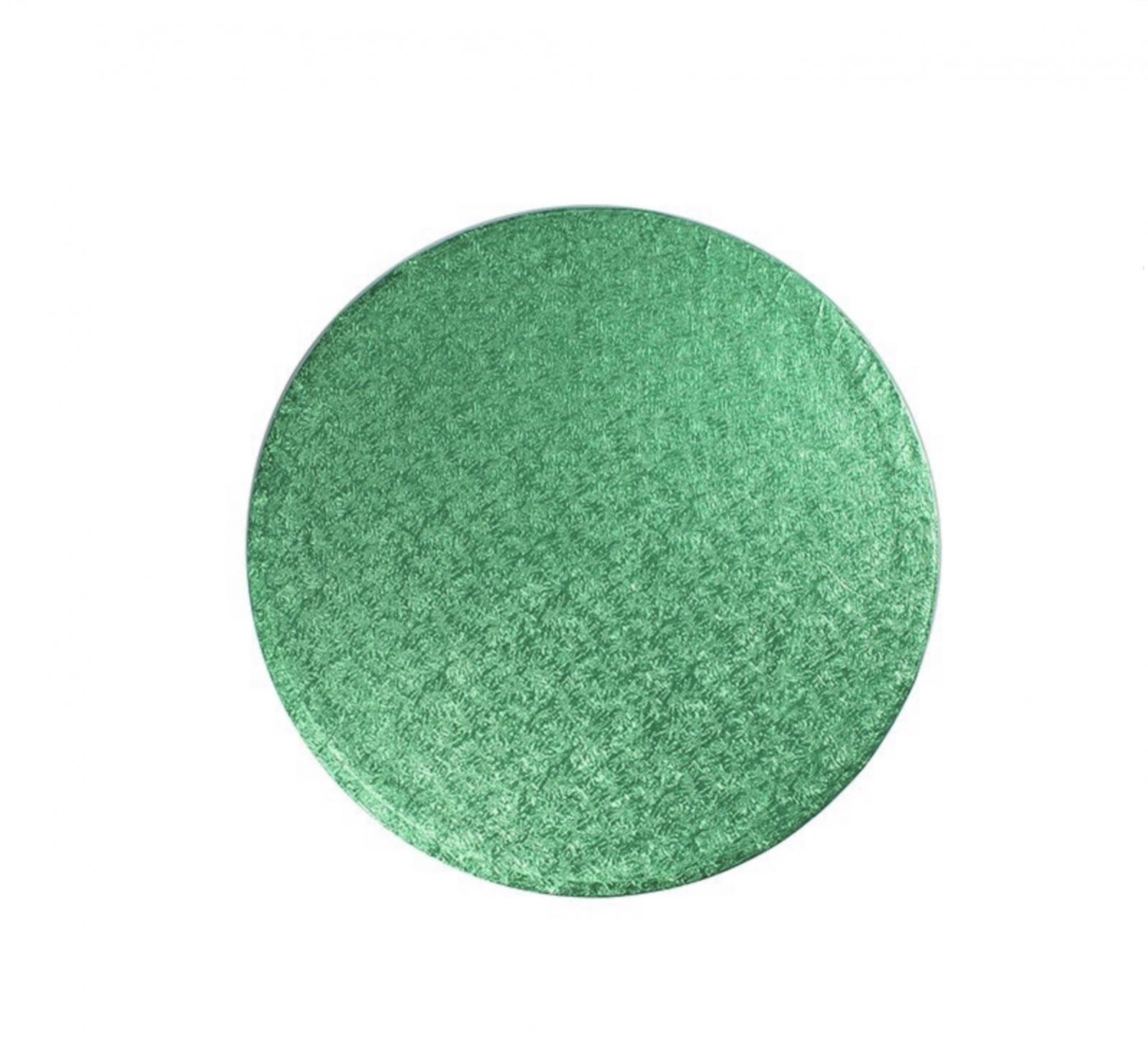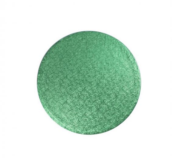 A cake drum is the strongest type of Cake Board. It has a bonded fibre board inner which is covered on the top and sides with a textured, green coloured foil and with white paper on the base.