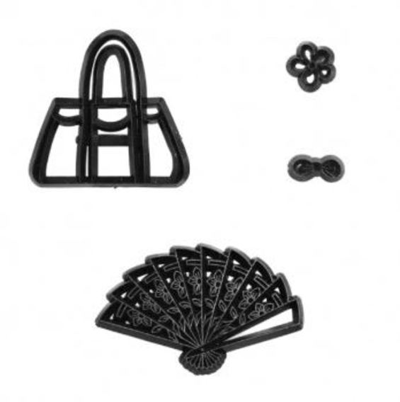 A 4 piece Handbag & Fan cutter set by Patchwork Cutters. The set includes hand bag, fan, small flower and bow embellishments. The beautifully detailed hand fan cutter, a handbag cutter and small flower and bow cutters are perfect for creating stunning cake and cupcake decorations. handbag approx 4cm / 40mm / just over 1_" diameter fan approx 5.5cm / 55mm / 2_" x 3.5cm / 35mm / 1_" small flower approx 15mm diameter small bow approx 15mm x 6mm.