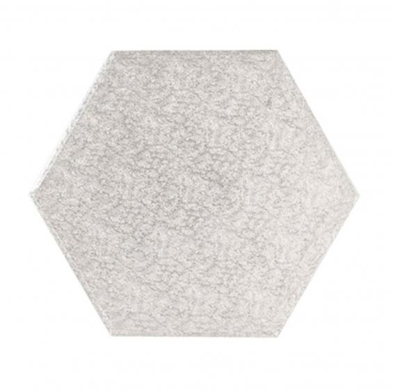 A cake drum is the strongest type of Cake Board. It has a bonded fibre board inner which is covered on the top and sides with a textured, silver coloured foil and with white paper on the base. The finished Cake Board is approximately 0.5" (13mm) thick, with a 13" hexagonal shaped top. These Cake Boards are supplied shrink wrapped in packs of 5, please note that the Cake Boards are not individually wrapped.