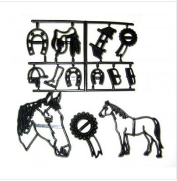 A 13 piece Horse themed cutters from Patchwork Cutters. This thirteen piece set has everything for the horse enthusiast, suitable for children's cakes or the horse racing fan. This fantastic set includES a standing horse, horses head, rosette and various pieces of equestrian tackle such as horseshoes, saddle, jumps, hat and comb. The horse shoes can also be used as decorations on wedding cakes. The horse head is 9.5cm x 9cm.