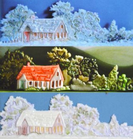 This side design creats a really nice little country cottage scene with trees and shrubs, specifically designed for the side of cakes. Makes an ideal Christmas snow scene, a holiday cottage, hunting lodge etc.