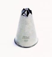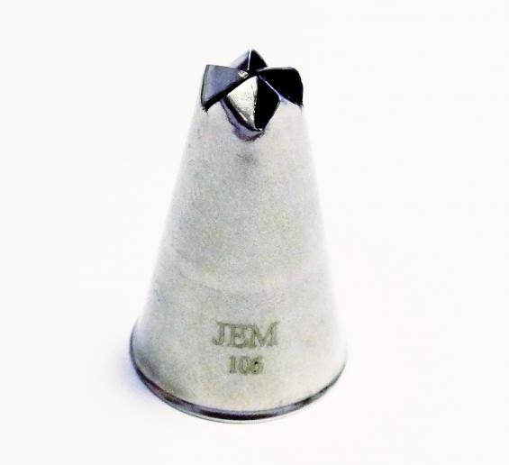 JEM Drop Flower Nozzle no. 106. Ideal for dropping and swirling small flowers.Dimensions: Tip diameter: 8.3 mm. Base diameter: 18 mm, Height: 30.5 mm. All nozzles work with parchment piping bags, standard bags and couplers and are made from high quality seamless stainless steel. Hand wash in warm soapy water is recommended. No. of Points: 5. All nozzles work with parchment, disposable and fabric piping bags. Dimensions: tip diameter 8.3 mm, base diameter 18 mm, height 30.5 mm. Made from high quality seamless stainless steel - NZ106