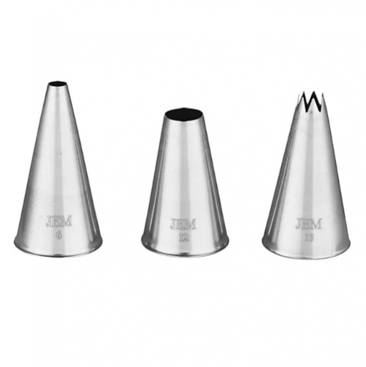 Set includes: Nozzle no. 12 - Pipe bulbs and lines. Great to use with various mediums like buttercream; Nozzle no. 6 - Pipe straight and wavy lines with this small border nozzle; Nozzle no. 18 - Pipe S and C scrolls for various designs or pipe shells around border edge.