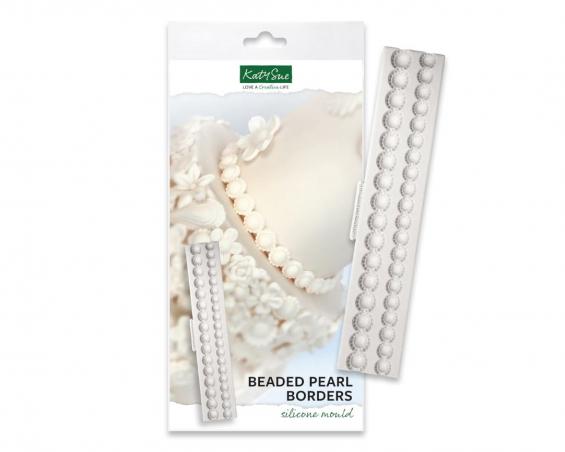 Food Safe Mould containing a set of two low rise pearl strings in two different sizes. The pearls can be removed as a string or used individually. Because of their shallow depth the pearls are perfect for adding a wide variety of design detail and will co-ordinate with the other pearl borders in the Katy Sue range.