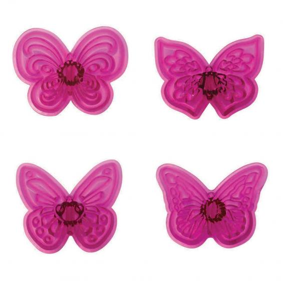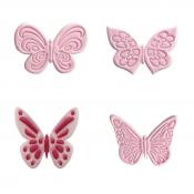 Set of 4 lacy butterflies cutters that are perfect for creating beautiful cut outs for placing on celebration cakes, cupcakes and cookies. Simply pop the cutters in your JEM roller pad, grease the cutters with JEM petal base, pop your paste over the top and roll your rolling pin over the back of the cutter to achieve neat, clean cut outs. Cutters measure 40mm (1 1/2 inches). Ideal for use with sugar paste, gum paste or flower modelling paste. Made from high quality ABS Thermoplastic. Cutter dia. 40 mm � (1 _ in �). Handwashing recommended - 1101CC004