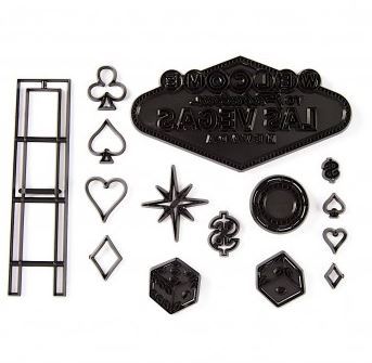 16 piece Las Vegas icing embosser cutter set by Patchwork Cutters. Great for poker players, casino nights or anyone who just loves Vegas includes heart, diamond, spade, clubs and dollar symbols (2 sizes each), 2 dice / die, casino chip, star burst, sign post (can also be used as roulette table grid) and the iconic 'Welcome to Fabulous Las Vegas Nevada' sign. Small symbols approx 1.5cm diameter, large symbols approx 3cm diameter, dice each approx 4cm diameter, sign approx 16cm x 8.5cm / 160mm x 85mm / 6_" x 3_", signpost stands approx 16cm / 160mm / <6_" high.