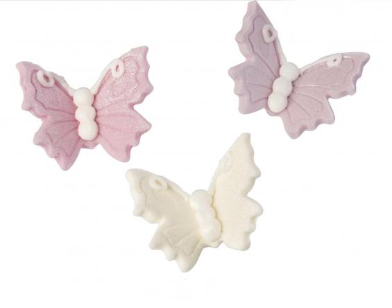 The pack contains 18 pastel pink, pastel lilac, and ivory butterfly cake decorations.