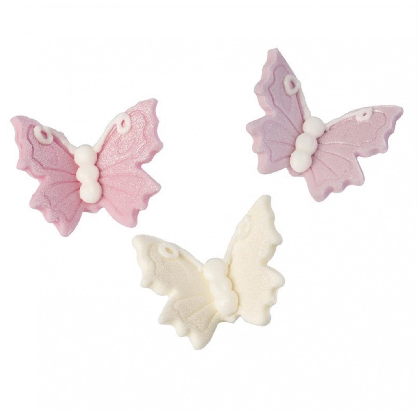 These 40mm edible decorations are boxed as 18. The food colours used in these decorations are azo free. The delightful butterfly cake decorations make great cupcake decorations, or they can be combined in a pattern to decorate a full sized cake. Colours may vary as the products are individually handmade. Packs contain 3 different coloured butterfly cake decorations.
