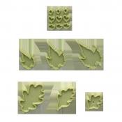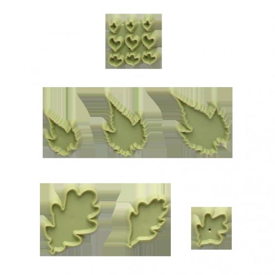 This is the perfect set to add to any foliage for flower & Foliage themed cakes. The leaf cutter sizes are a follows, 27x27mm, 25x18mm, 24x17mm, 35x23mm, 40x26mm 33x18mm, 43x30mm Ideal for use with sugar paste, gum paste or flower modelling paste. Made from high quality ABS Thermoplastic. Set of 7 mixed leaf cutters. Handwashing recommended - 103FF057