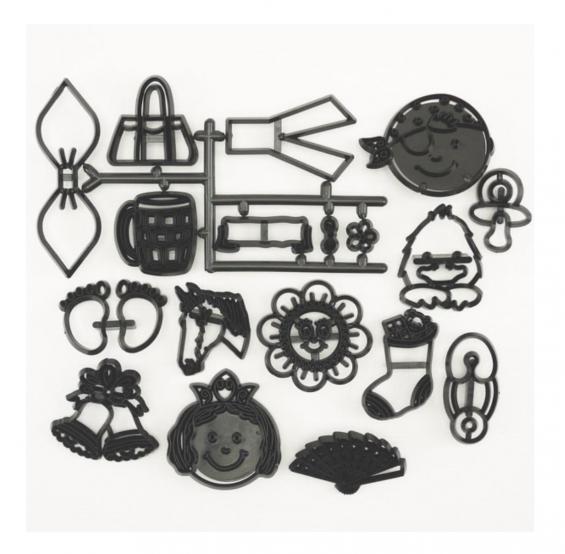 This Patchwork Cutters - Assorted Mini Set includes a wide range of mini cutters and embossers including pirates face, bells, handbags, feets etc.