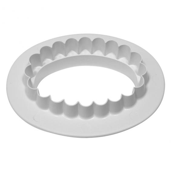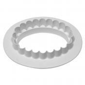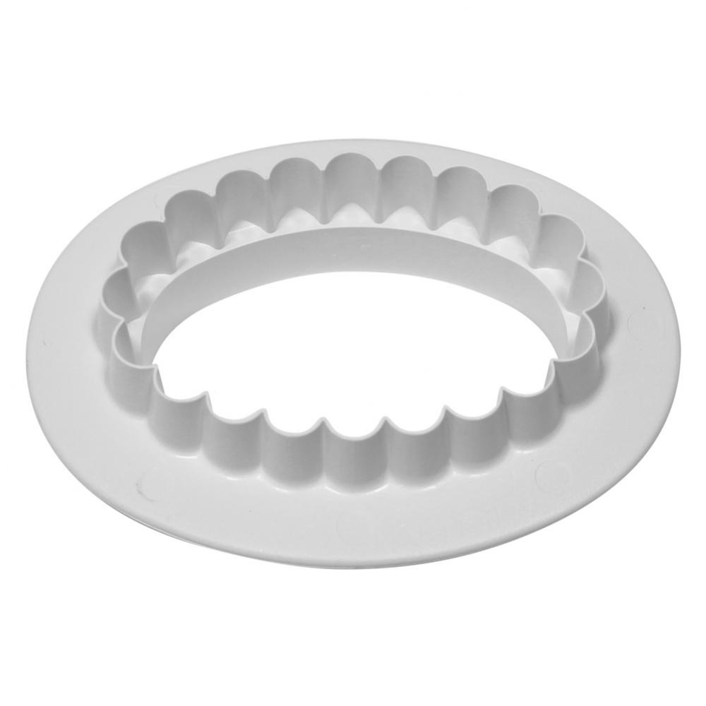This plain & fluted oval plaque is a great cutter to have for your cake decorating needs. One side of the cutter is a fluted oval plaque with the other side a plain oval plaque allowing you to create different designs for your cakes. This cutter is approximately 70mm. - OV513