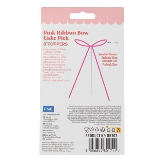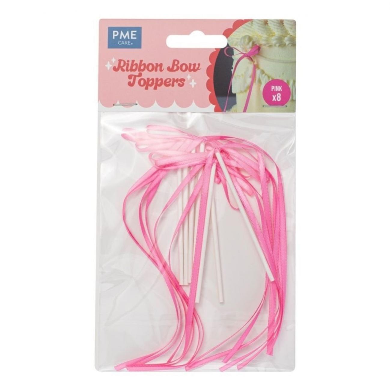 PME Ready-made satin ribbon bow toppers with picks in Pink, each pack contains 8 ready to use bows on picks.