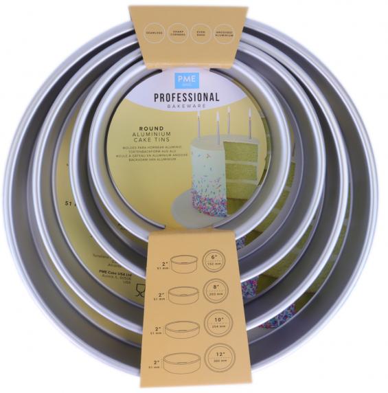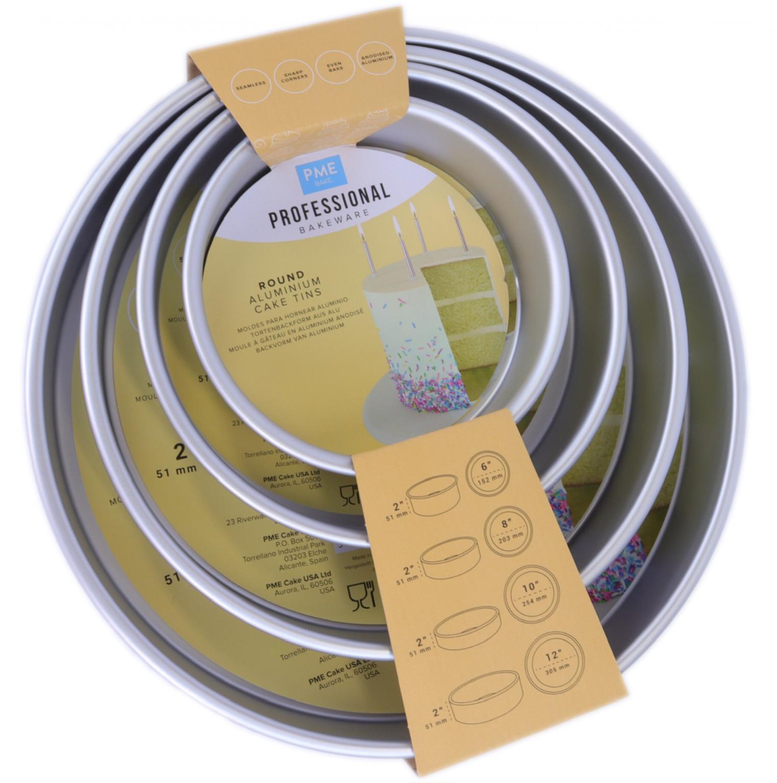 This set includes 4 Round Cake Pans with a diameter of 6, 8, 10 and 12 inches, all with a depth of 2 inches