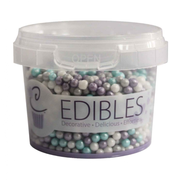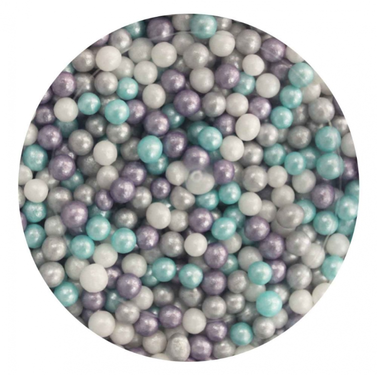 Features a blend of white, turquoise and lilac coloured balls - perfect for Frozen themes, Christmas bakes, mermaid and unicorn themes.