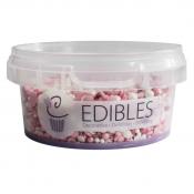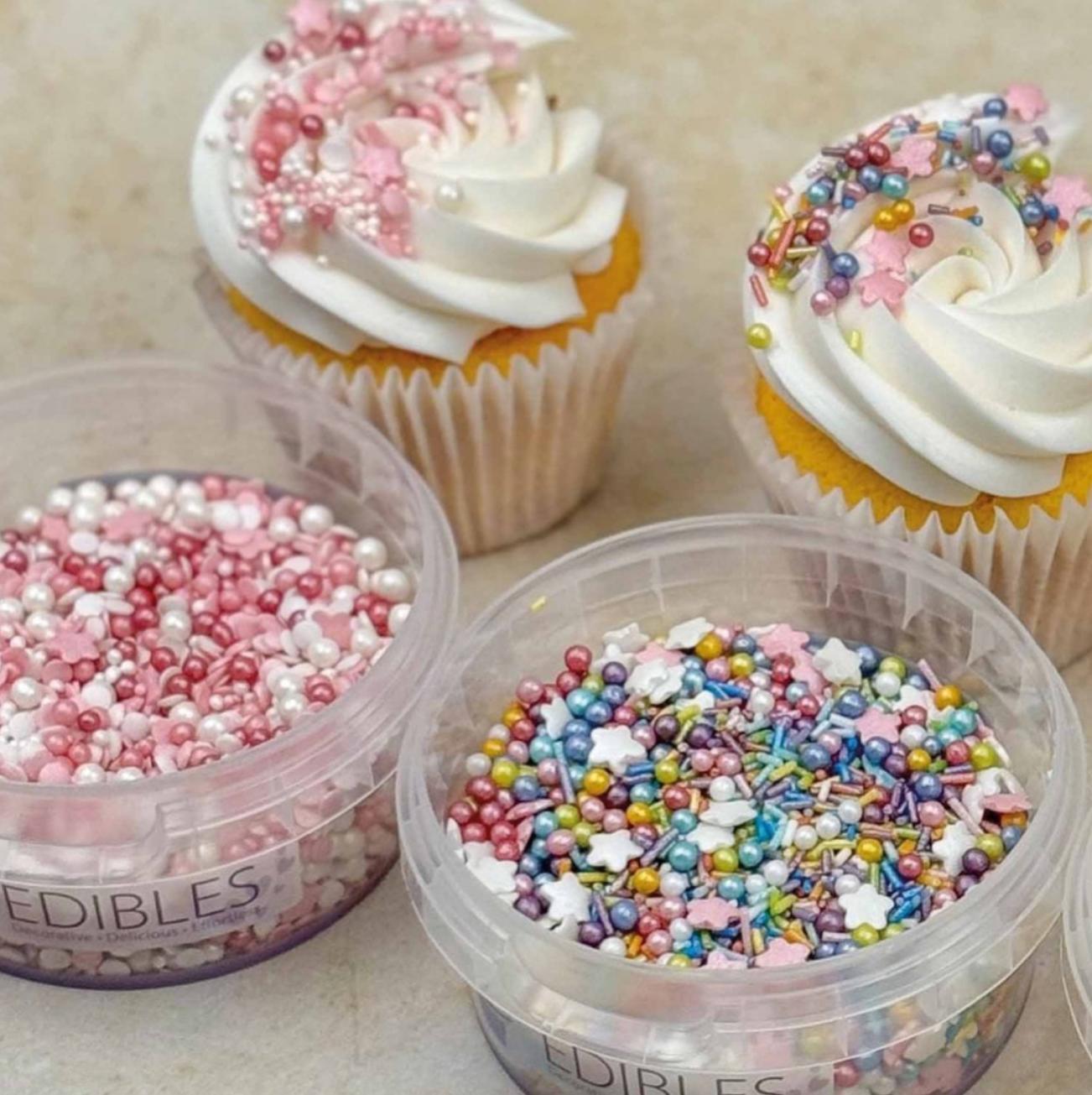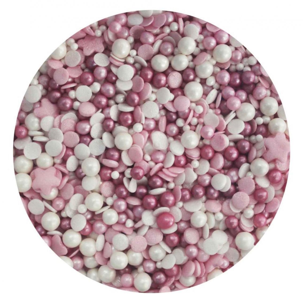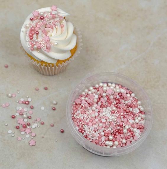 Featuring a lovely blend of pink and pearl flowers, confetti discs, pearls and nonpareils, this sprinkle mix is perfect for adding a fun finish to any cake, cupcakes, cookies, traybakes, donuts and more!