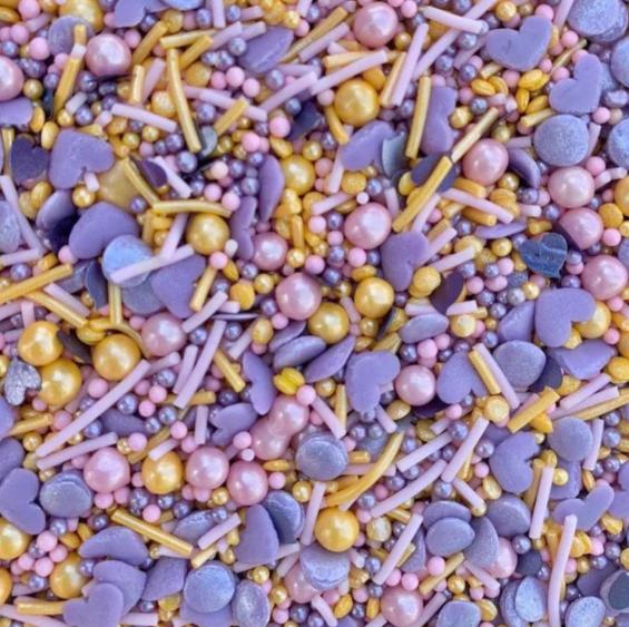 Featuring a bright and colourful blend of lilac, purple, gold and pale pink shimmer hearts, pearls, nonpareils and sugar strands. Perfect for adding a fun finish to any cake, cupcakes, cookies, traybakes, donuts and more!