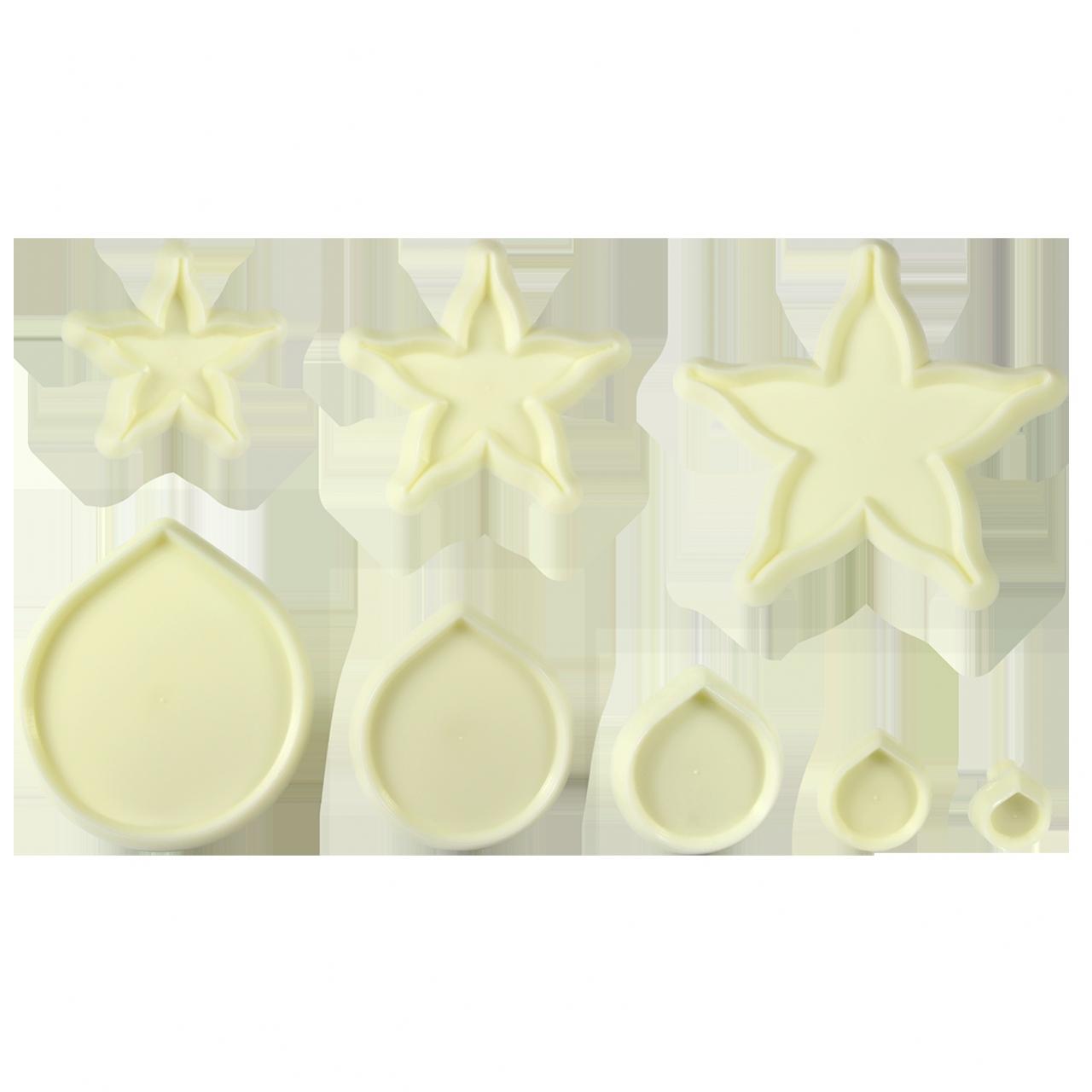 This JEM rose petals & calyx cutters are perfect for making those beautiful flowers on top of weddings cakes. This set comes with 8 pieces, 3 calyx (11 x 30mm, 16 x 40mm, 23 x 56mm) & 5 rose petals (9 x 11mm, 15 x 17mm, 21 x 25mm, 30 x 33mm, 41 x 47mm). - 103FF004