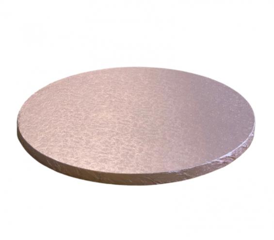 A cake drum is the strongest type of Cake Board. It has a bonded fibre board inner which is covered on the top and sides with a textured, rose gold coloured foil and with white paper on the base. The finished Cake Board is approximately 0.5" (13mm) thick, with a 10" round top. Colours may vary.