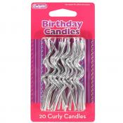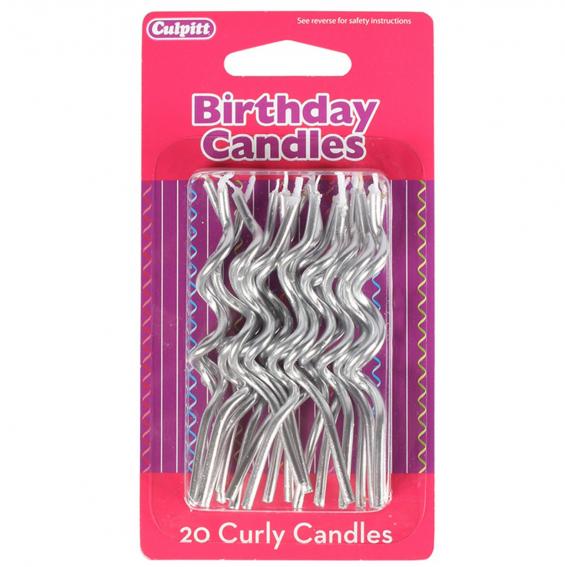Funky silver curly candles with no holders, these look fantastic on a wide range of cakes, particularly on stacked cakes. 20 curly candles per pack.