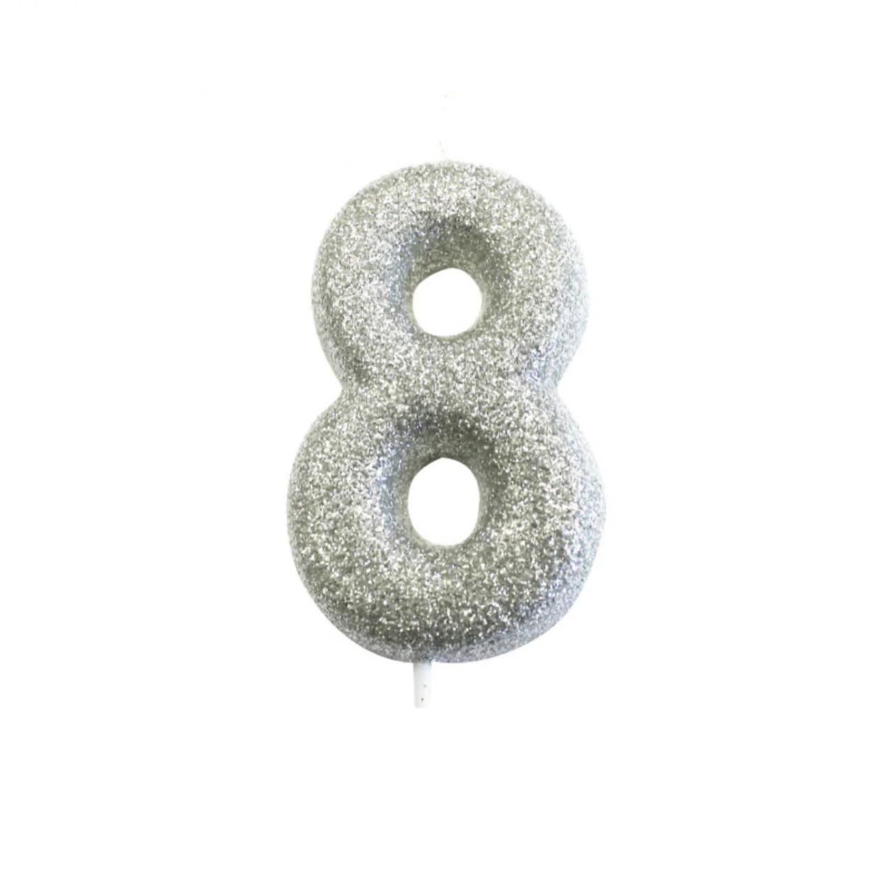 Make a wish on this gorgeous number 8 glitter candle! The contemporary font and silver glitter finish create an eye-catching custom cake topper.